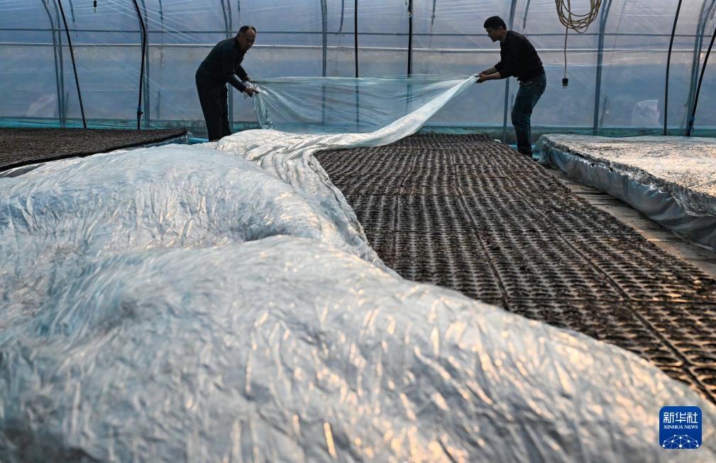 12月11日,在河南省商丘市夏邑县会亭镇朱瓦房村大棚育苗基地,乡民为刚刚下种的育苗苗床掩盖薄膜保温。