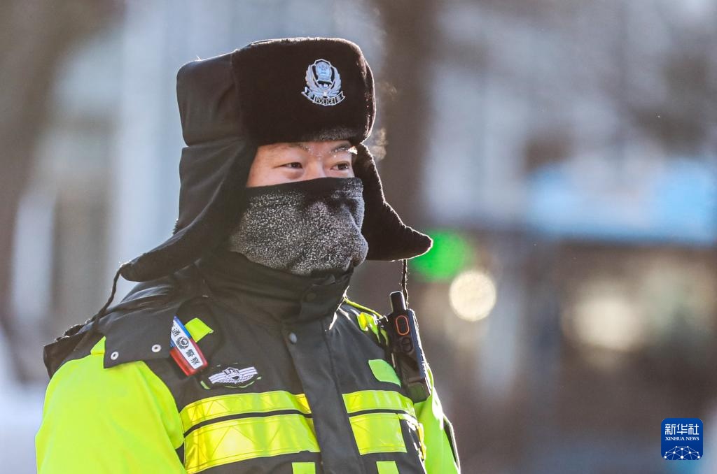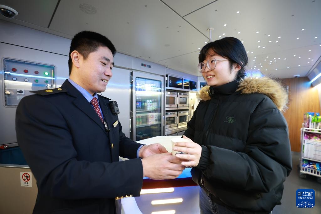 12月11日,在哈尔滨西站,G904次列车工作人员为刚上车的旅客送上热茶。