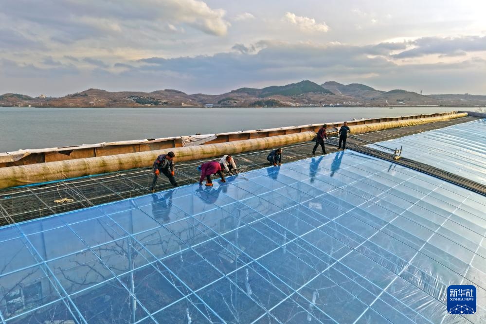 12月11日,在山东省烟台市福山区张格庄镇,农民为樱桃大棚更换新的塑料薄膜(无人机相片)。