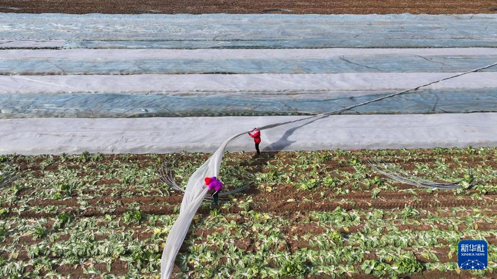 12月11日,在山东省东营市广饶县李鹊镇,农民为作物掩盖防寒无纺布(无人机相片)。