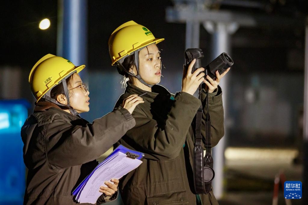12月10日,在河南省商丘市睢县110千伏董店变电站内,国网河南省电力公司睢县供电公司工作人员在对设备展开夜巡。