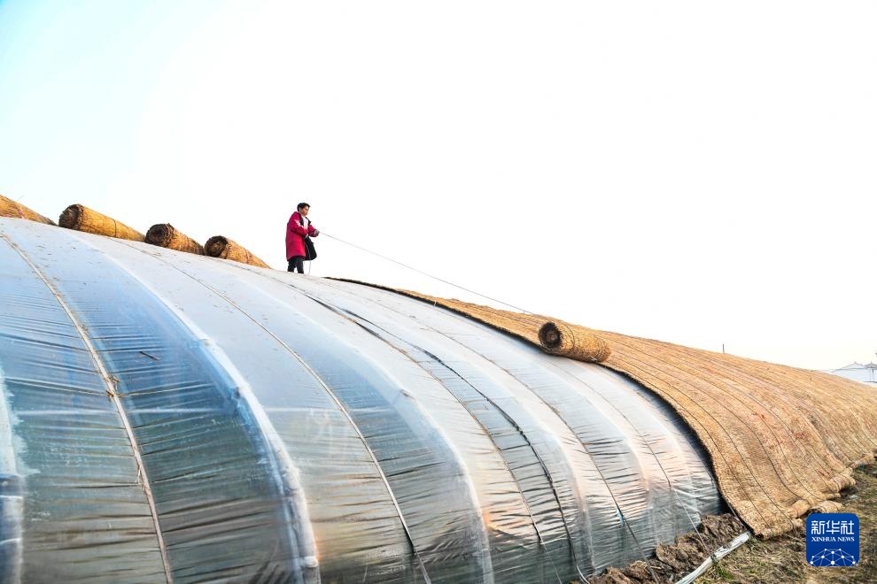 12月11日,在山东省临沂市平邑县当地镇,乡民为栽培的蔬菜麦苗掩盖保温薄膜(无人机相片)。