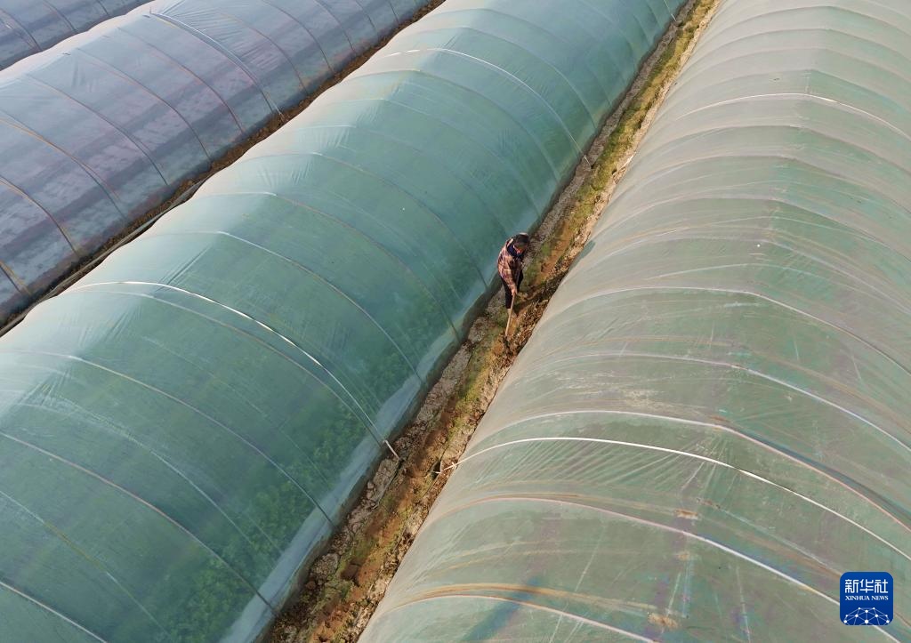 12月10日,河南省南阳市新野县城郊乡吕庄村,乡民在蔬菜栽培基地对蔬菜大棚进行封土加固(无人机相片)。