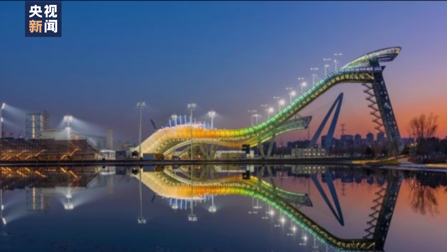 白天赛事时首钢大跳台万人瞩目,夜晚的它在五彩斑斓的灯光中也是别样美丽。西班牙《阿斯日报》5日在报道中就以“灰姑娘的水晶鞋”来形容首钢大跳台。