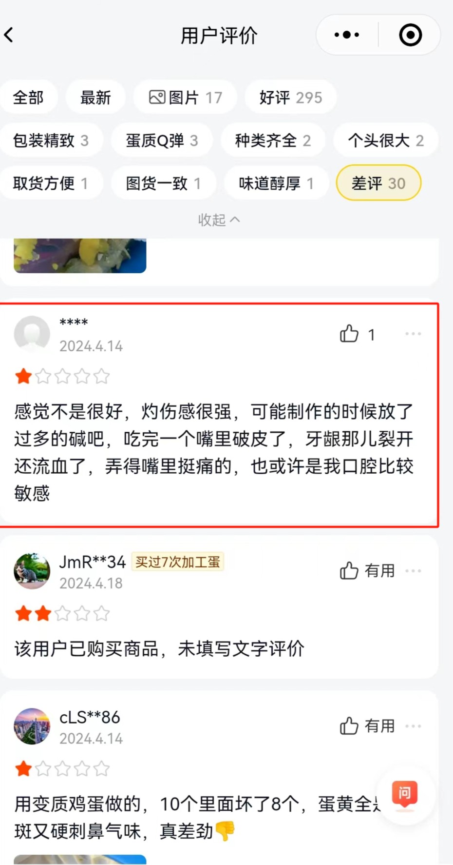 根据刘文提供的信息,帮办记者在美团优选的商品界面中看到,目前涉事变蛋已售出2.3万,评论区确实有消费者反映变蛋“变质”的问题,也有消费者表示与刘文一样,吃完变蛋后口腔有灼伤感,这让刘文更加确信自己并非个例。