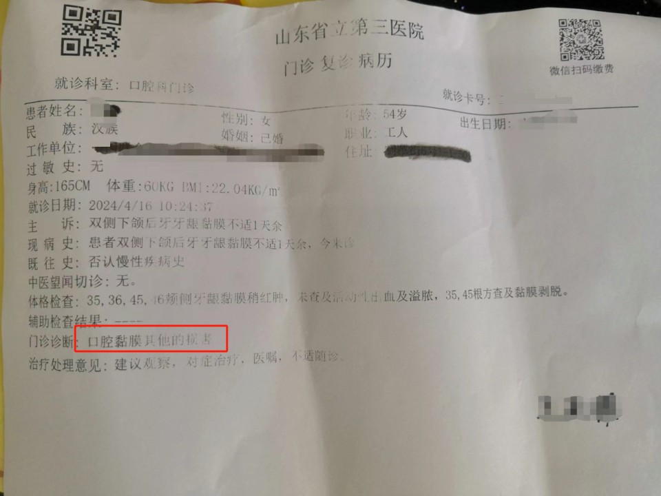 根据刘文提供的医院病历,帮办记者发现,她的主要症状为牙龈黏膜红肿和牙龈黏膜剥落,最后诊断为“口腔黏膜其他的损害”。“之前我也买过变蛋,我本身对于变蛋这类食品是不过敏的,而且当时也并未出现不适的情况。”刘文说,这次吃了两个变蛋后紧接着就出现不适的症状,她怀疑是变蛋中的碱性物质腐蚀所致。